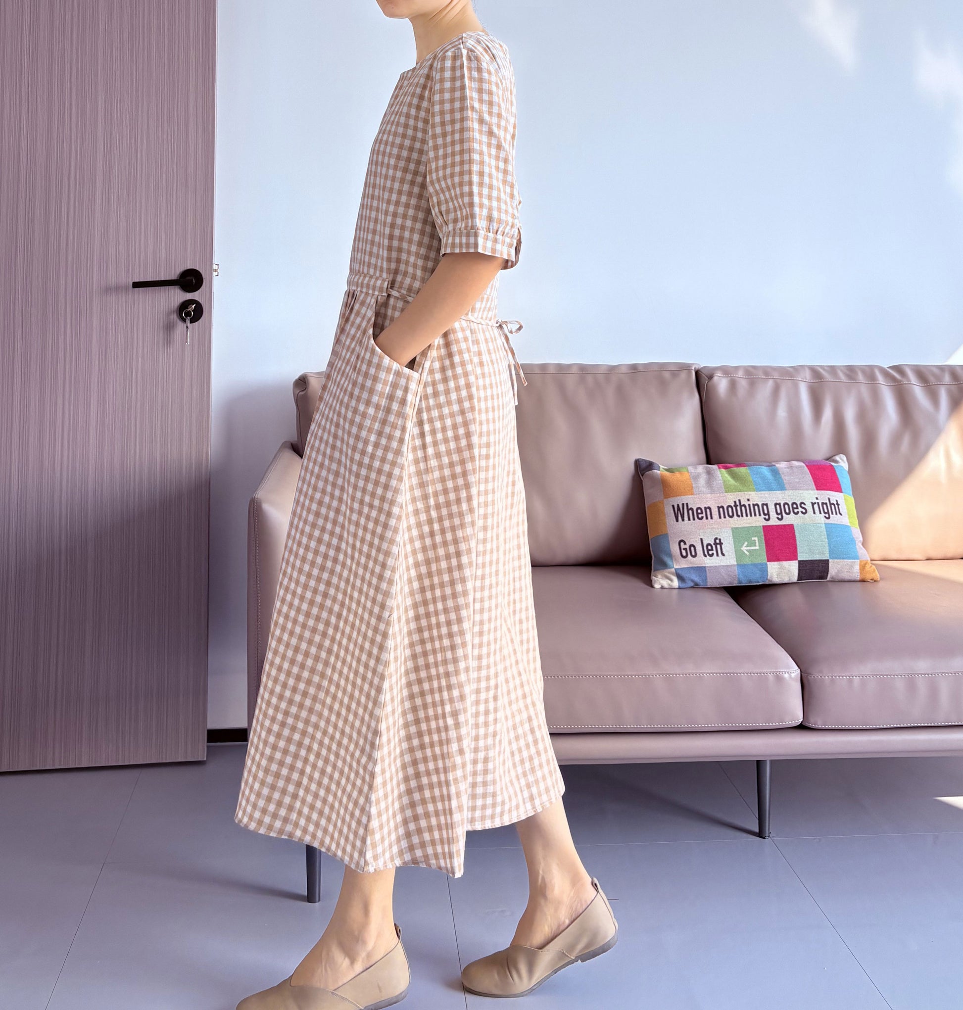- Features: Crewneck, empire waist and plaid pattern, casual summer dress with 2 side pockets, short sleeve, drawstring and aline design, this linen dress gives a casual and stylish look, fashion and elegant.