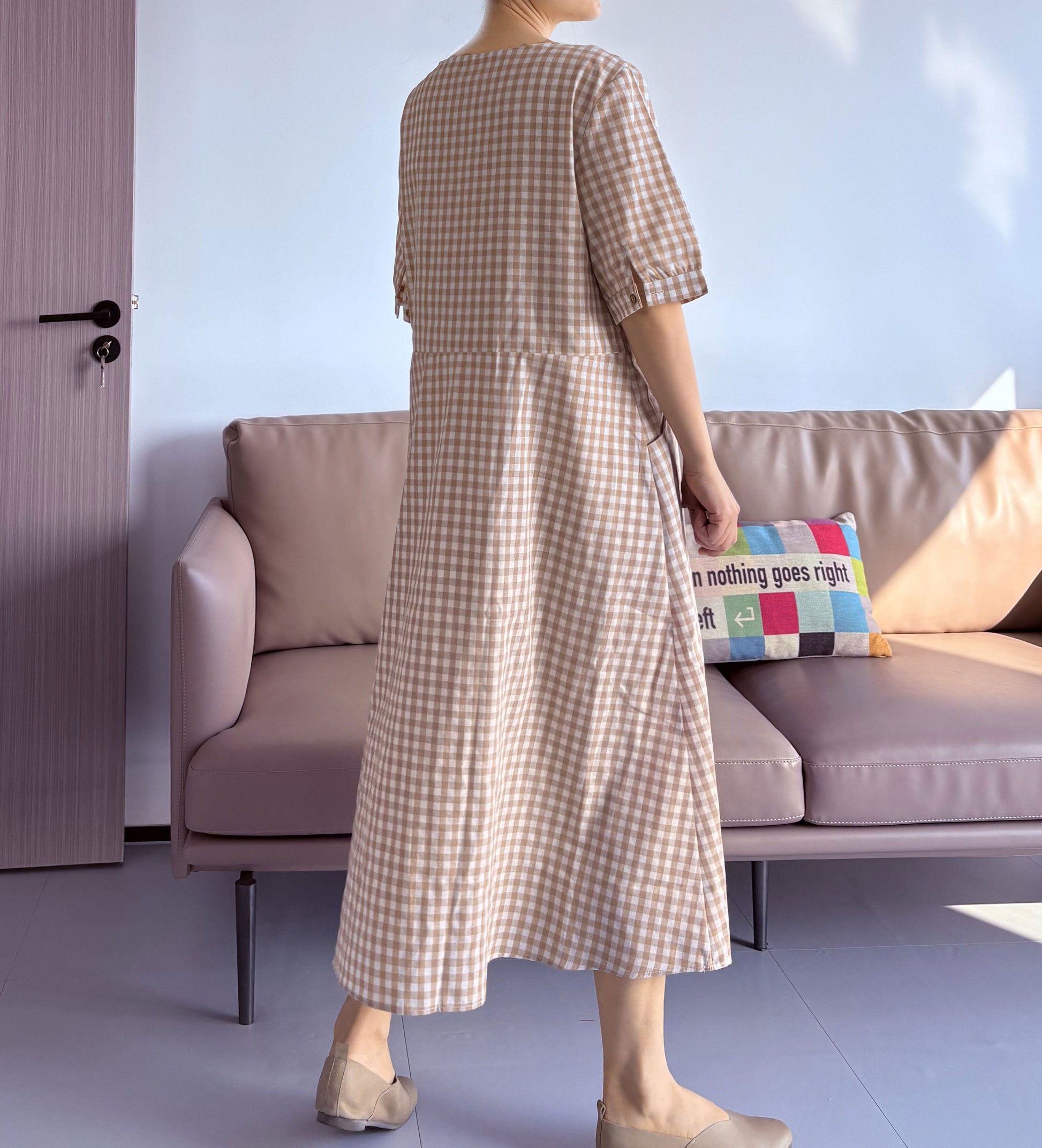 - Material: 45% Linen, 55% Cotton. Plaid midi dresses for women made of breathble and lightweight fabric, comfortable to wear, elastic waist design easily dress up or down.