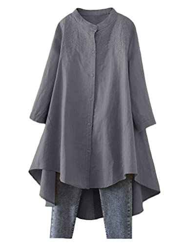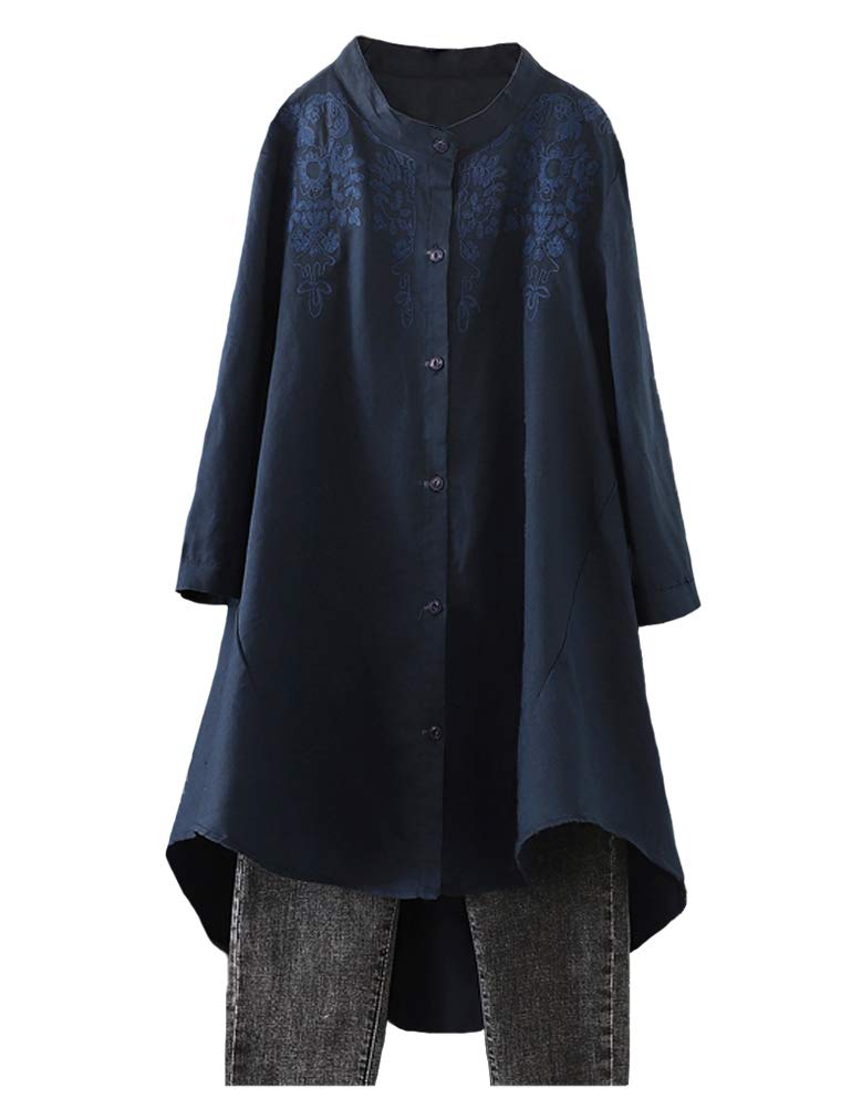 Minibee Women's Cotton Linen Shirt High Low Button Down Embroidered Blouse