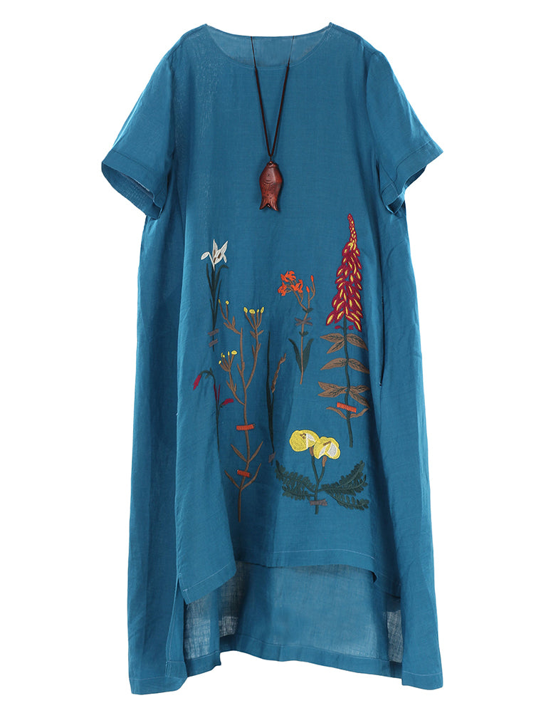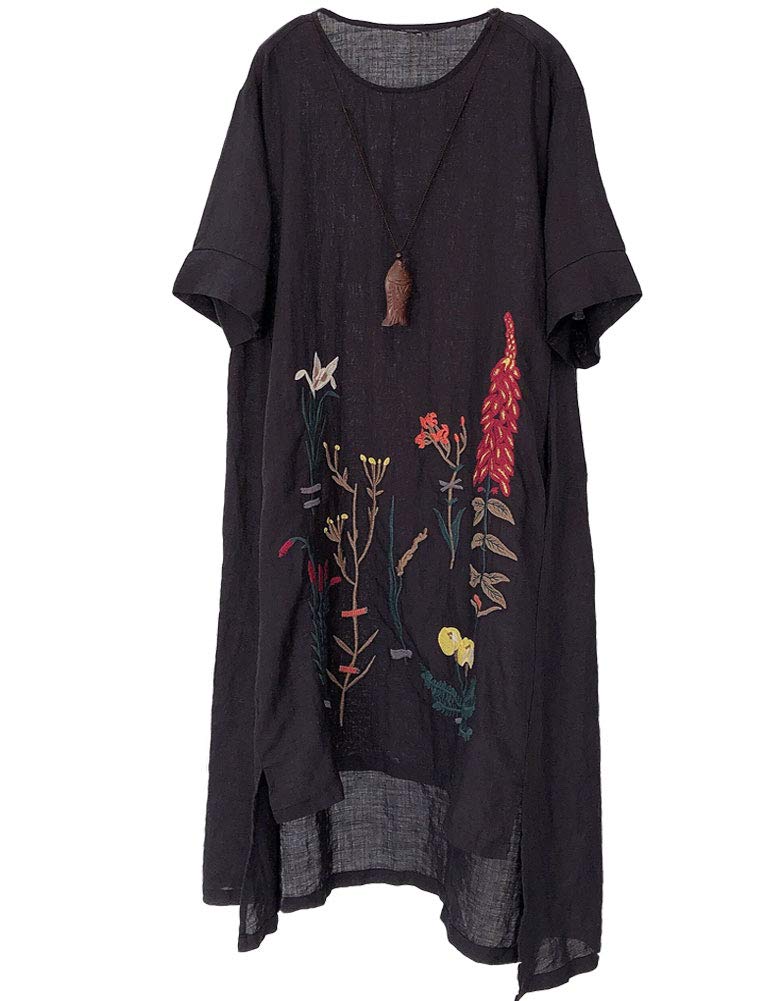 Minibee Women's Embroidered Linen Dress Summer A-Line Sundress Hi Low Tunic Clothing