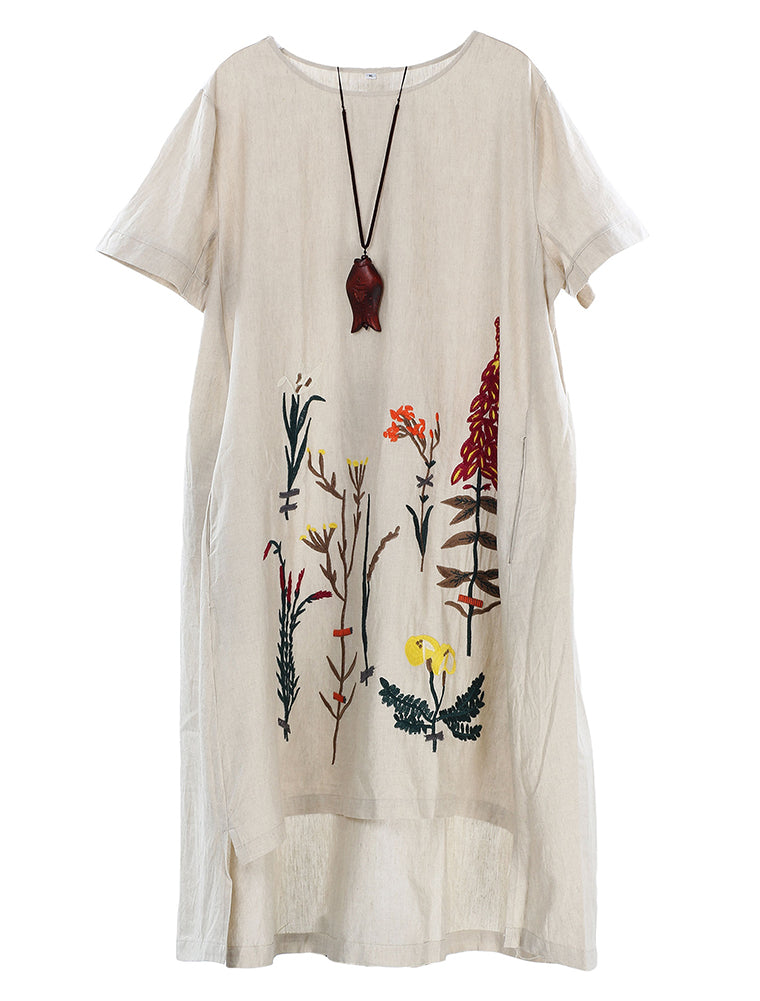 - Unique floral embroidered cotton linen tunic sundress, hi low hem, round neck, dress with loose hem and waist, great for pregnant women