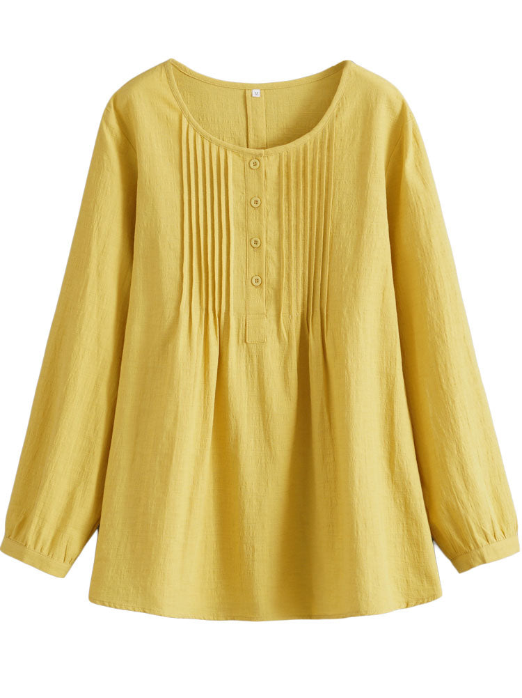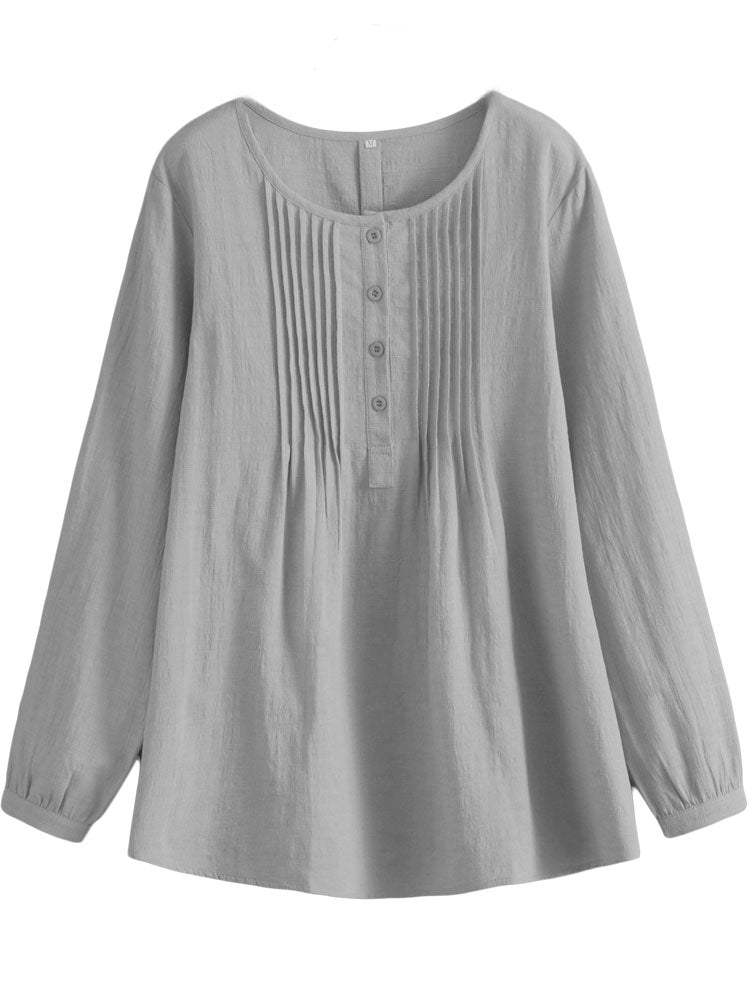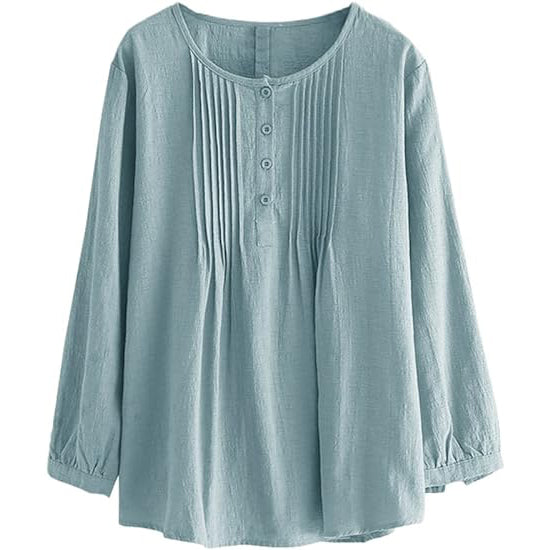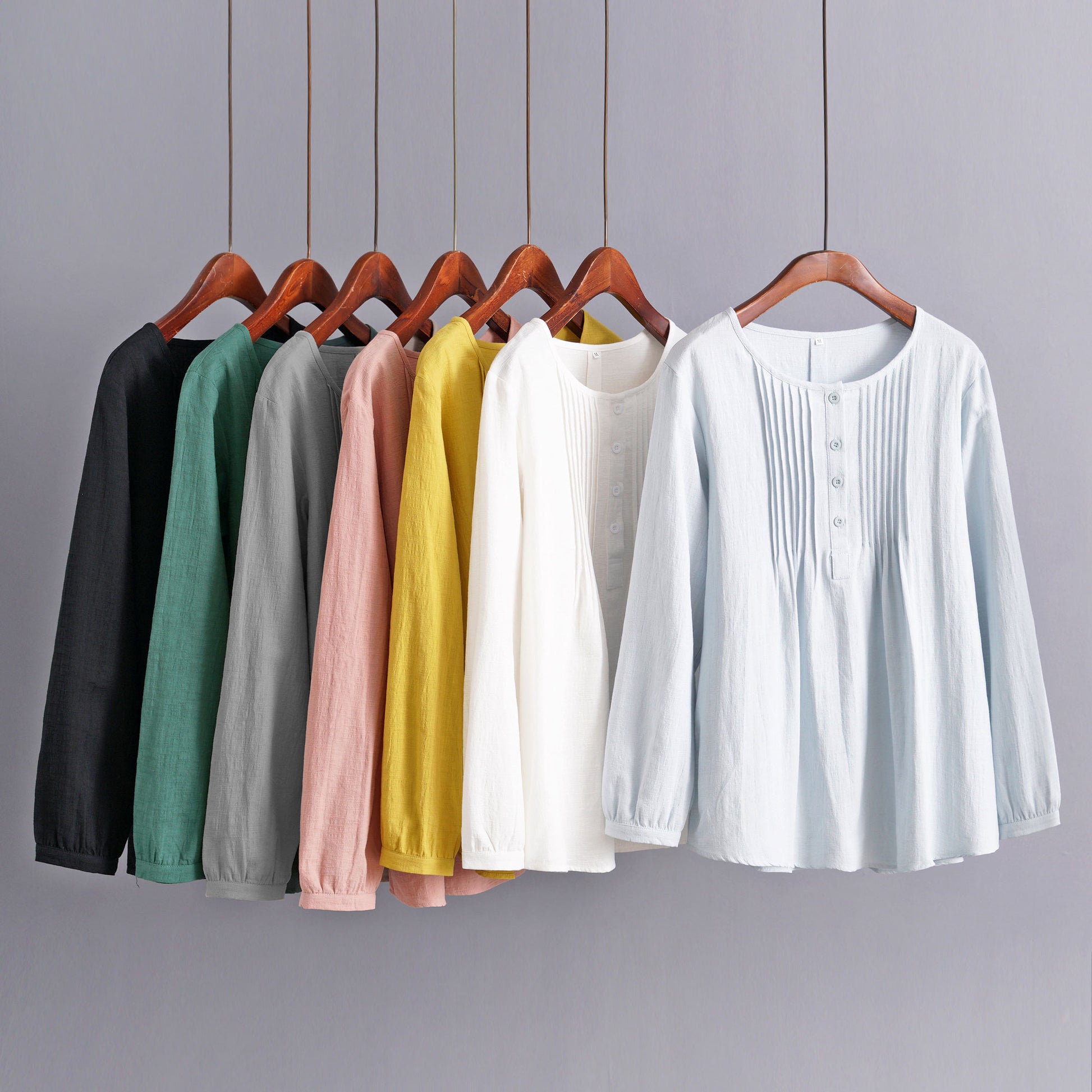 - new Solid color linen tops, linen blouse, button down shirts, long sleeve with round neck, front four button and pleated design, linen tops for women